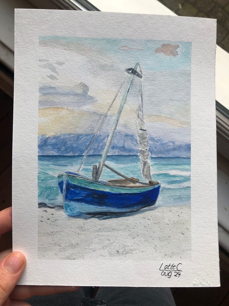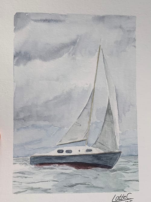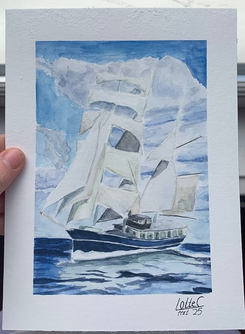Dit is een aquarel van de Thallassa, het schip wat mijn huis voor zes maanden zal worden. Deze heb ik gemaakt met het doel: om het af te drukken als print en notitieboek. Ook krijgt deze aquarel een mooi plekje in mijn kamer.